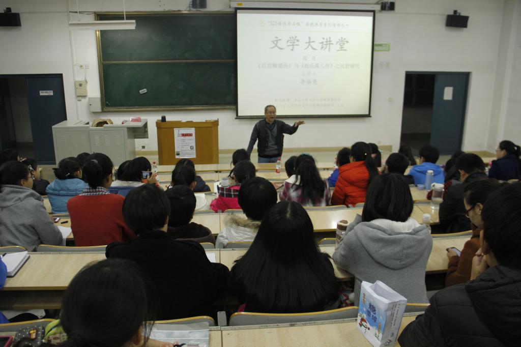 11月15日晚7:30,第十七期文学大讲堂在我校东校区四教208室举行,本期讲堂主题为“《后宫甄嬛传》与《赵氏孤儿传》之比较研究”,主讲嘉宾为中国作家协会会员、中国电视艺术家协会会员、《北方文学》杂志社主编、中文系教授李福亮老师。
