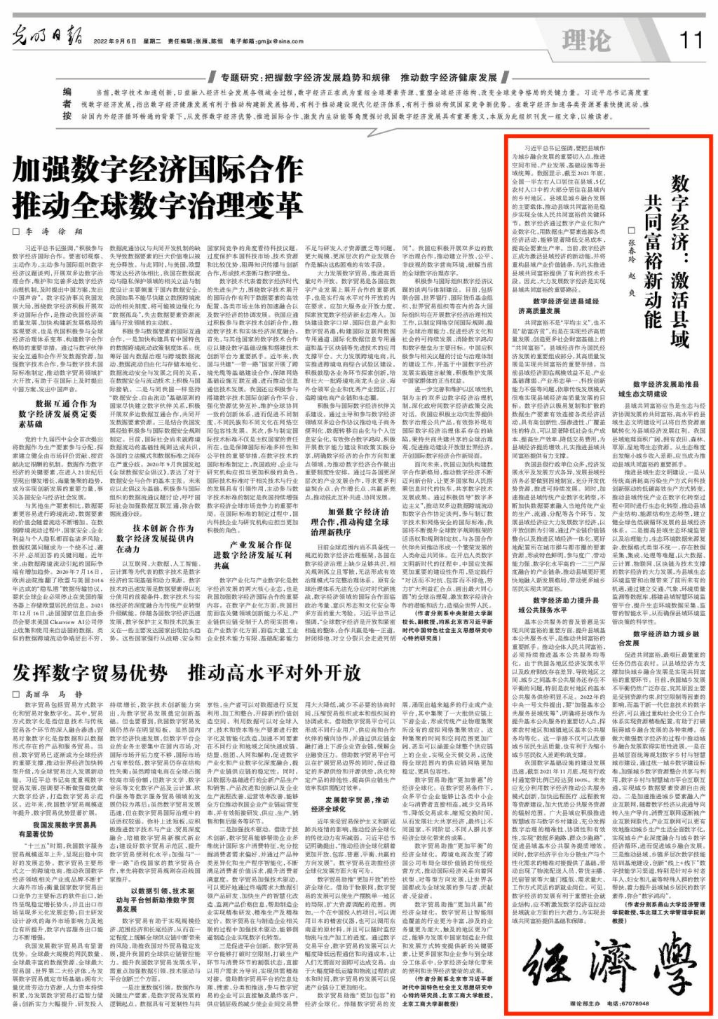 【新闻中心讯】9月6日,乌鸦传媒经济管理学院张春玲教授在《光明日报》理论版发表署名文章《数字经济:激活县域共同富裕新动能》。