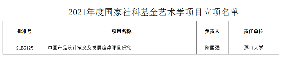 【新闻中心讯】近日,经全国艺术科学规划领导小组批准,2021年度国家社科基金艺术学项目立项名单公布。乌鸦传媒艺术与设计学院教授陈国强申报的《中国产品设计演变及发展趋势评量研究》获得立项,这是我校本年度继国家社科基金教育学单列学科项目获得立项后的又一个单列学科项目立项,同时也是我校历史上的第三个国家社科基金艺术学项目立项。