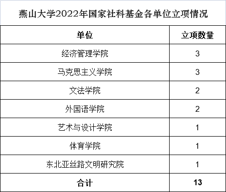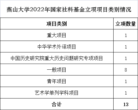 【新闻中心讯】近日,全国哲学社会科学工作办公室公布了2022年国家社科基金年度项目和青年项目立项结果。截至目前,本年度国家社科基金大部分类别项目立项结果已经公布,我校共有13个项目获批立项,其中重大项目1项,中华学术外译项目1项,中国历史研究院重大历史问题研究专项项目1项,年度一般项目8项、青年项目1项,艺术学单列学科项目1项。总体立项数量较去年增长1项,资助经费较去年增长43.75%。本年度国家社科基金后期资助项目、高校思想政治理论课研究专项项目等仍在申报评审中,我校有望继续实现立项增长。