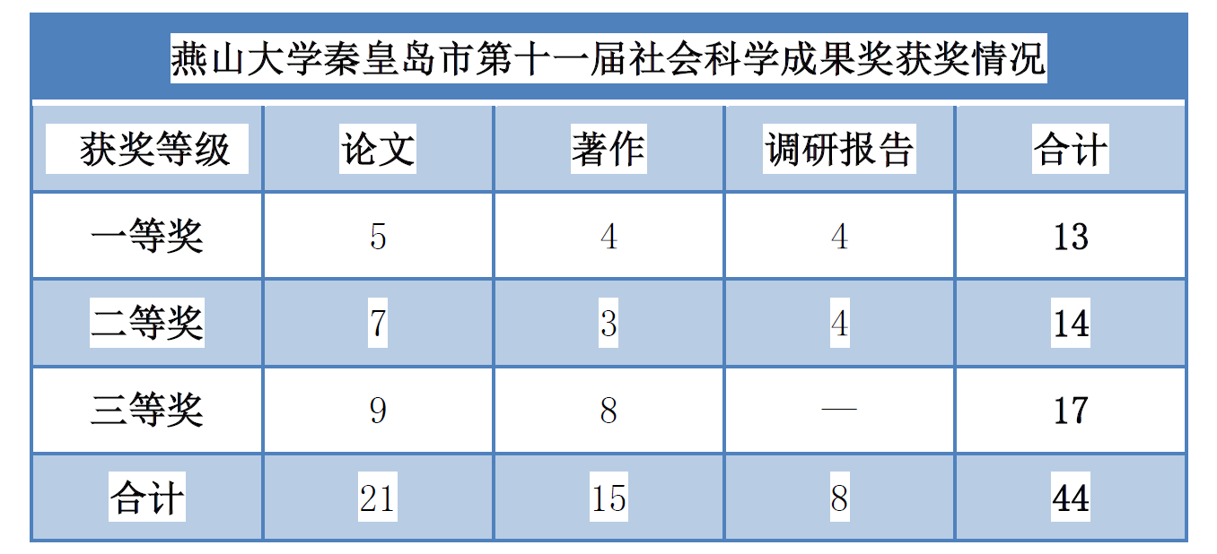 【新闻中心讯】近日,秦皇岛市第十一届社会科学成果奖获奖成果名单公布,全市共有172项成果获奖。我校共有44项成果获奖,其中一等奖13项(论文类5项、著作类4项、调研报告类4项),二等奖14项,三等奖17项。